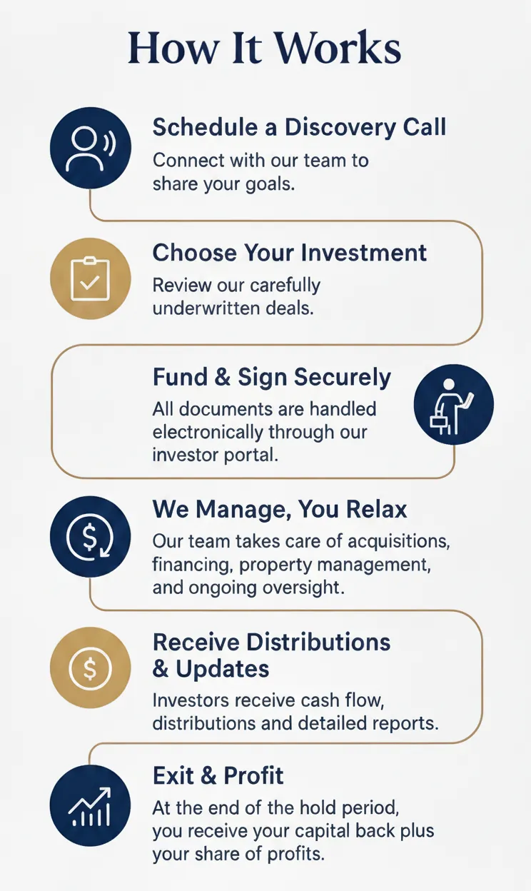 Each investment typically has a 3–5 year hold period. However, our team continuously evaluates market conditions and may pursue an earlier exit if it maximizes investor returns.